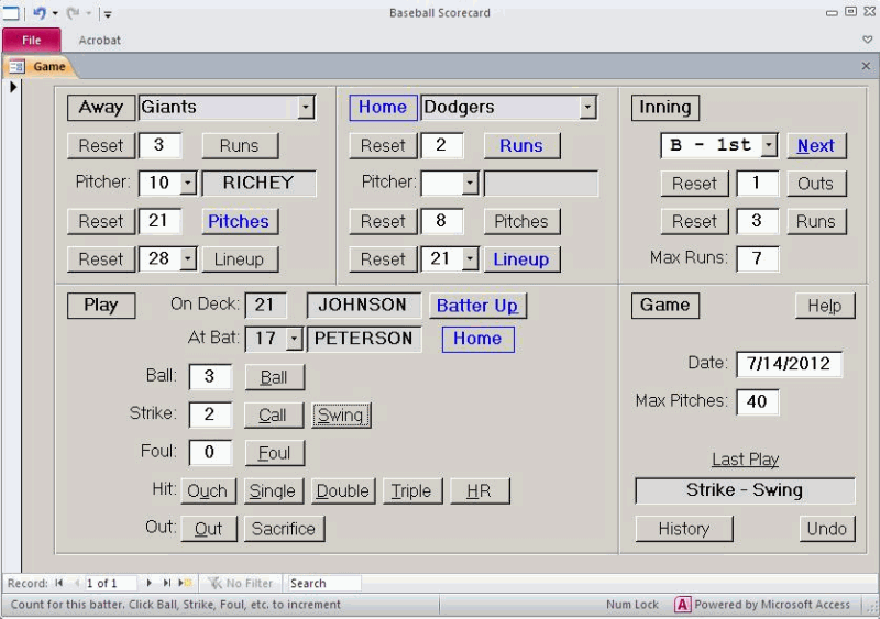 I originally developed this program as a simple way to count pitches, balls, strikes and outs, keeping score on the sidelines of Little League games. After awhile, even the “official” score keeper often turned to me for confirmation. I had fun doing it. So I am publishing this for others to try out.